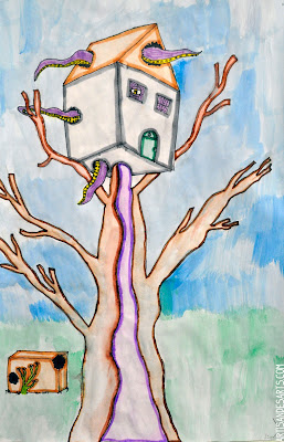 This is a fantastic project that I did with my grade 5/6 class before March break. I wanted to do something with 2 point perspective, as we've done a lot of perspective work this year in class, and I came across these 2 point perspective treehouses on artsonia. Loved it, and had to do them with my kids!
